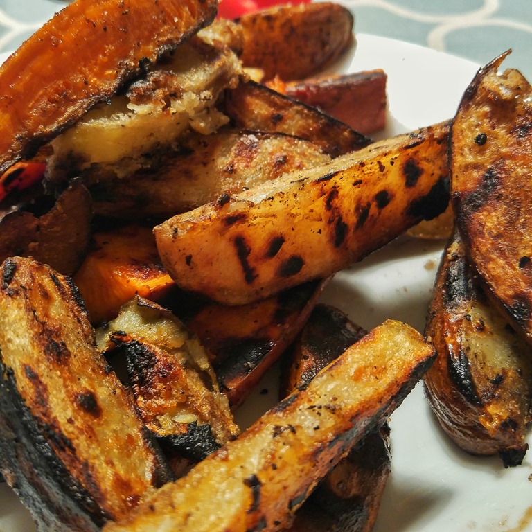 We also grilled up some russet potato wedges after par-boiling them patting them dry and tossing them in olive oil, Atlantic Saltworks Coarse Salt and black pepper. they come out crispy on the outside and soft and fluffy on the inside-