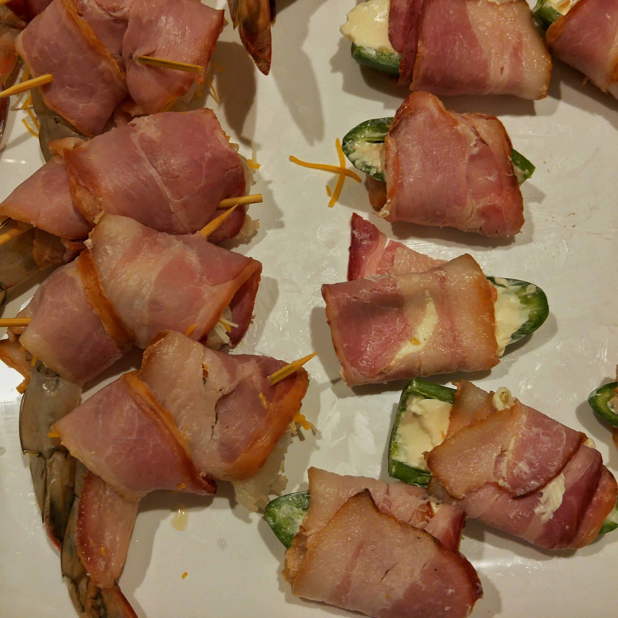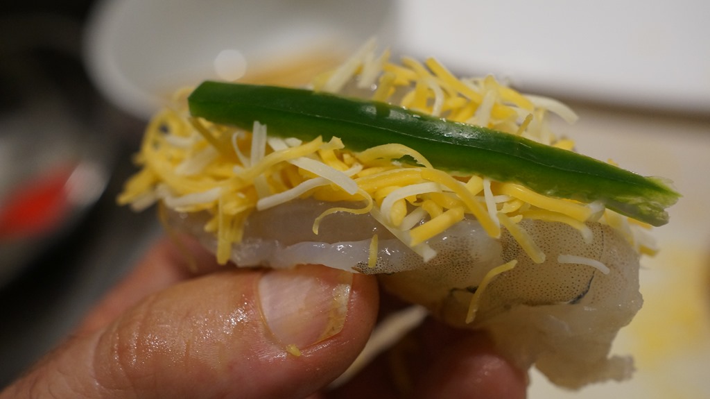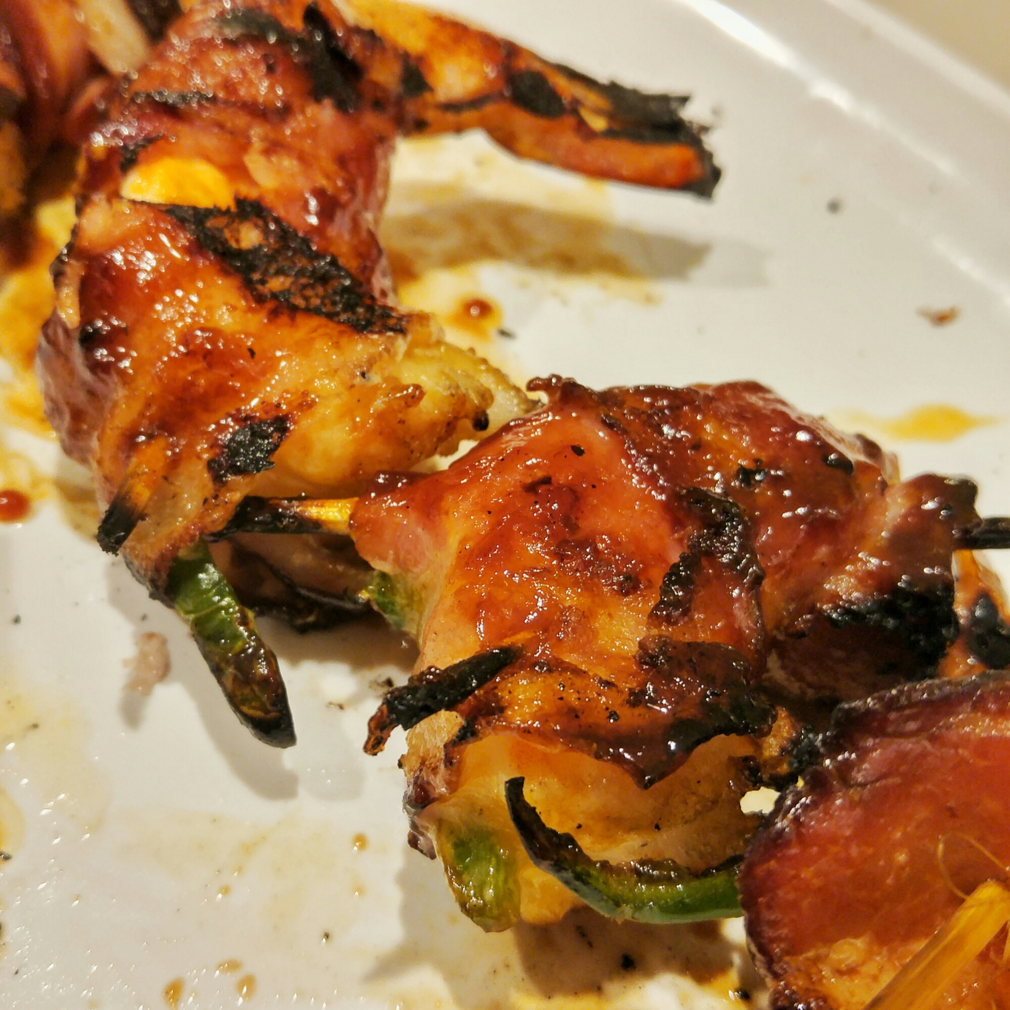 The shimp butterflied and stufed with three cheese blend and a jalepeno spear-