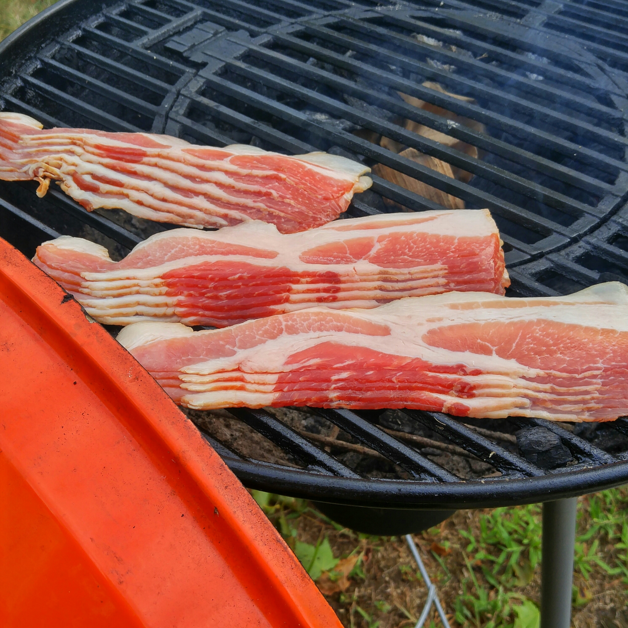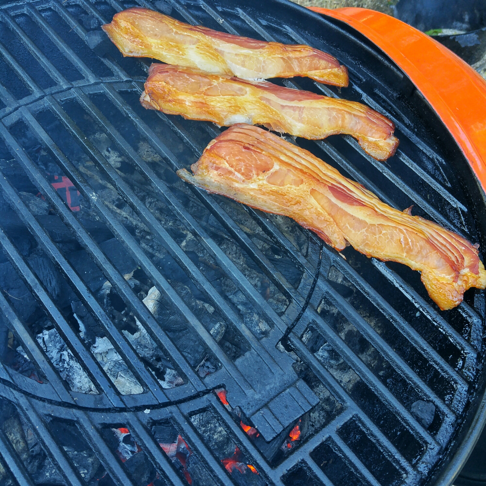 Once the bacon browns up a little baste with favorite bar b que sauce and place over the coals for a minute to let that sauce glaze up but be sure not to leave on too long or the sugars will burn. then baste the other side and flip, a minute or two on the other side and theyโre ready!