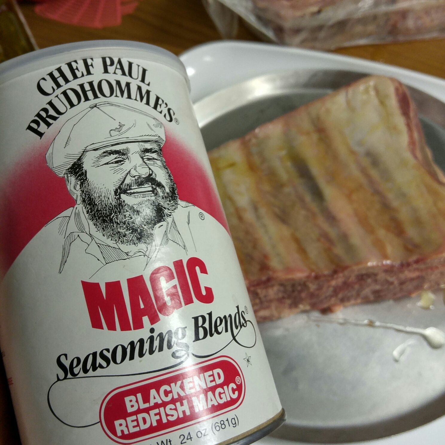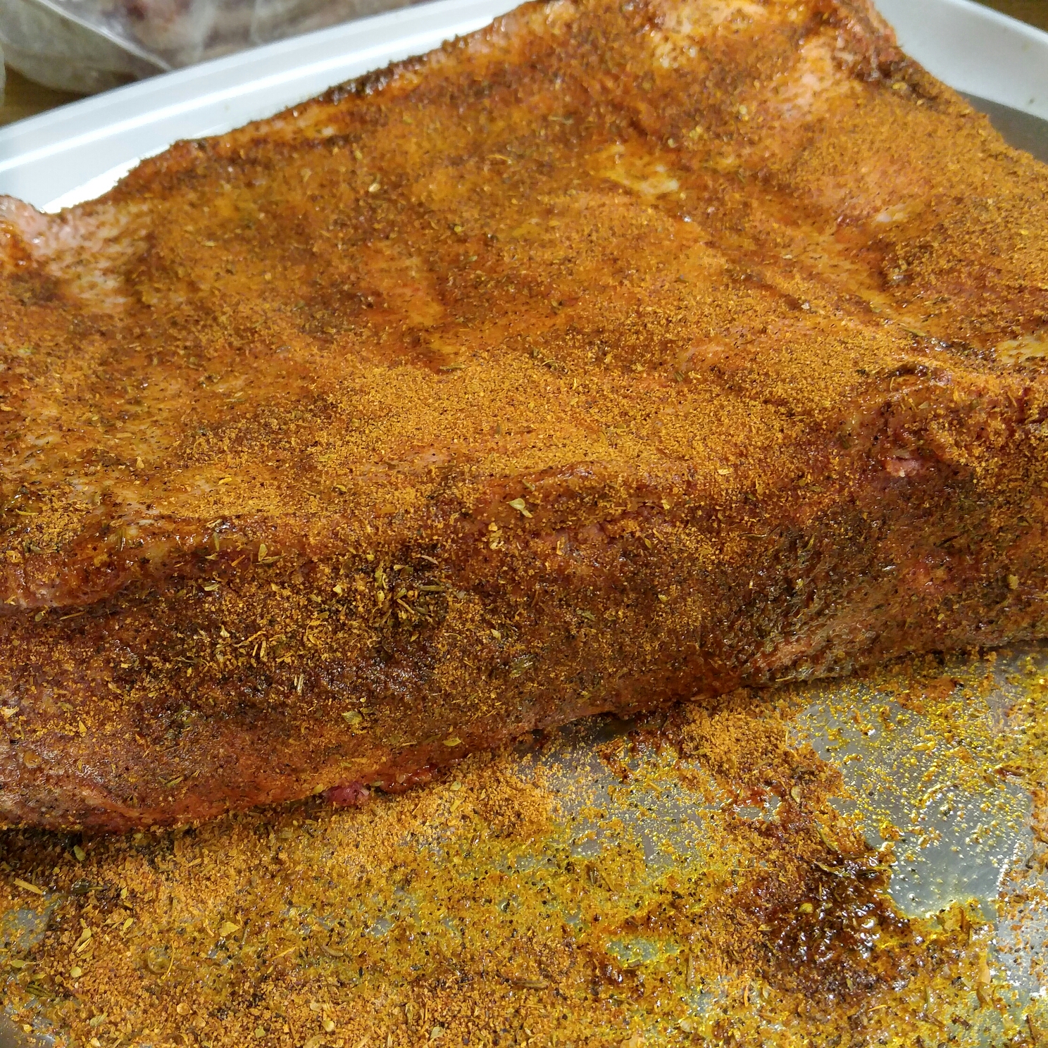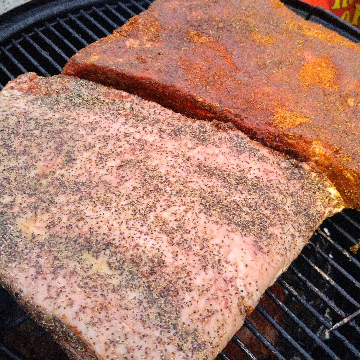 Setting up for a low and slow smoke looking for 275 smoker temp.ย Rubbed three sections of the short ribs with Paul Prudhomme Seasoning and one with coarse salt and crushed black pepper after coating with olive oil.