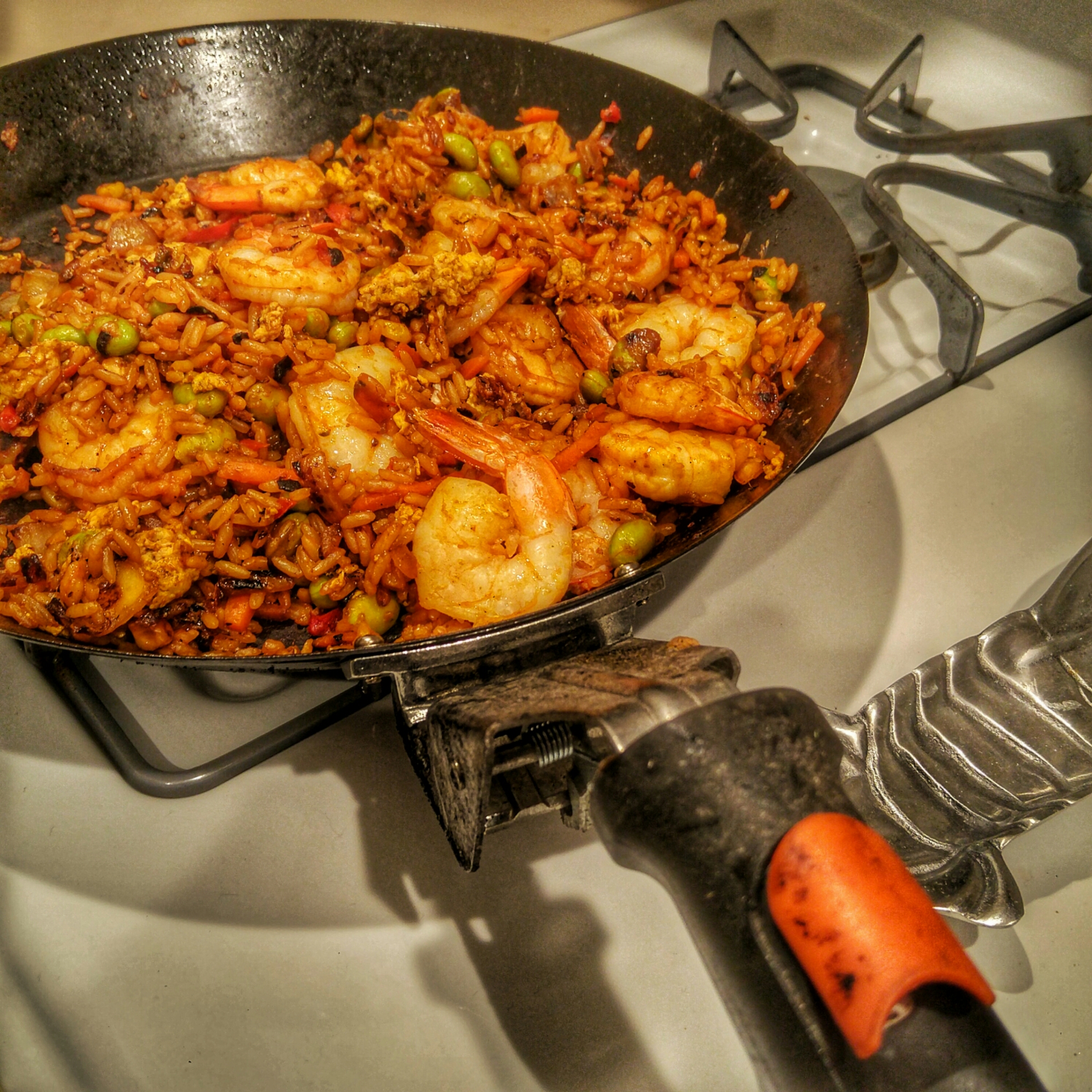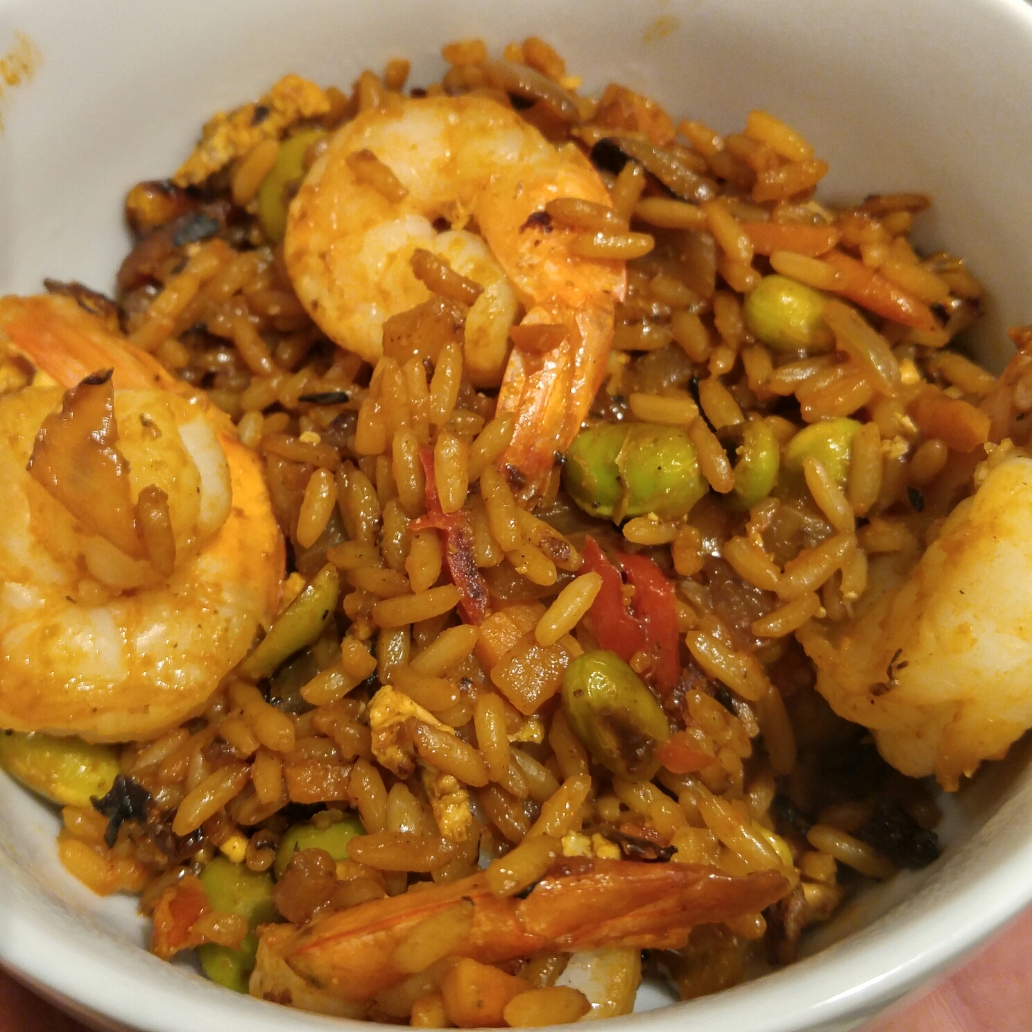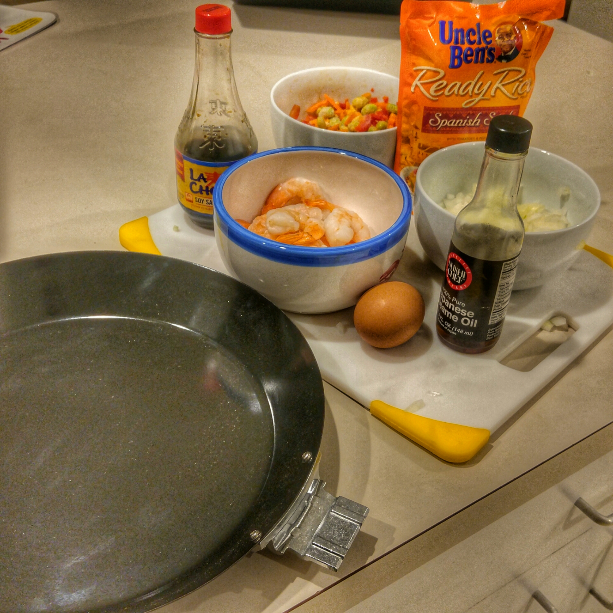 Once the veggies are warmed up make a little space and crack an egg and scramble it up. Toss in the rest of the ingredients and keep tossing til the shrimp are slightly browned