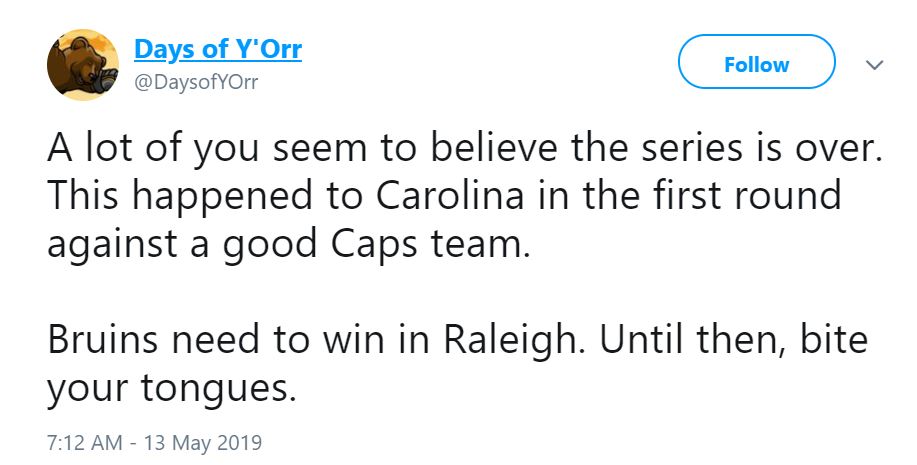 We Still Gotta Play The Games @NHLBruins … May 13, 2019 — 1 Comment via Days of Y’Orr@DaysofYOrr Share this:TweetPocket Click to email a link to a friend (Opens in new window) Email Click to share on Reddit (Opens in new window) Reddit Click to share on WhatsApp (Opens in new window) WhatsApp Like Loading...